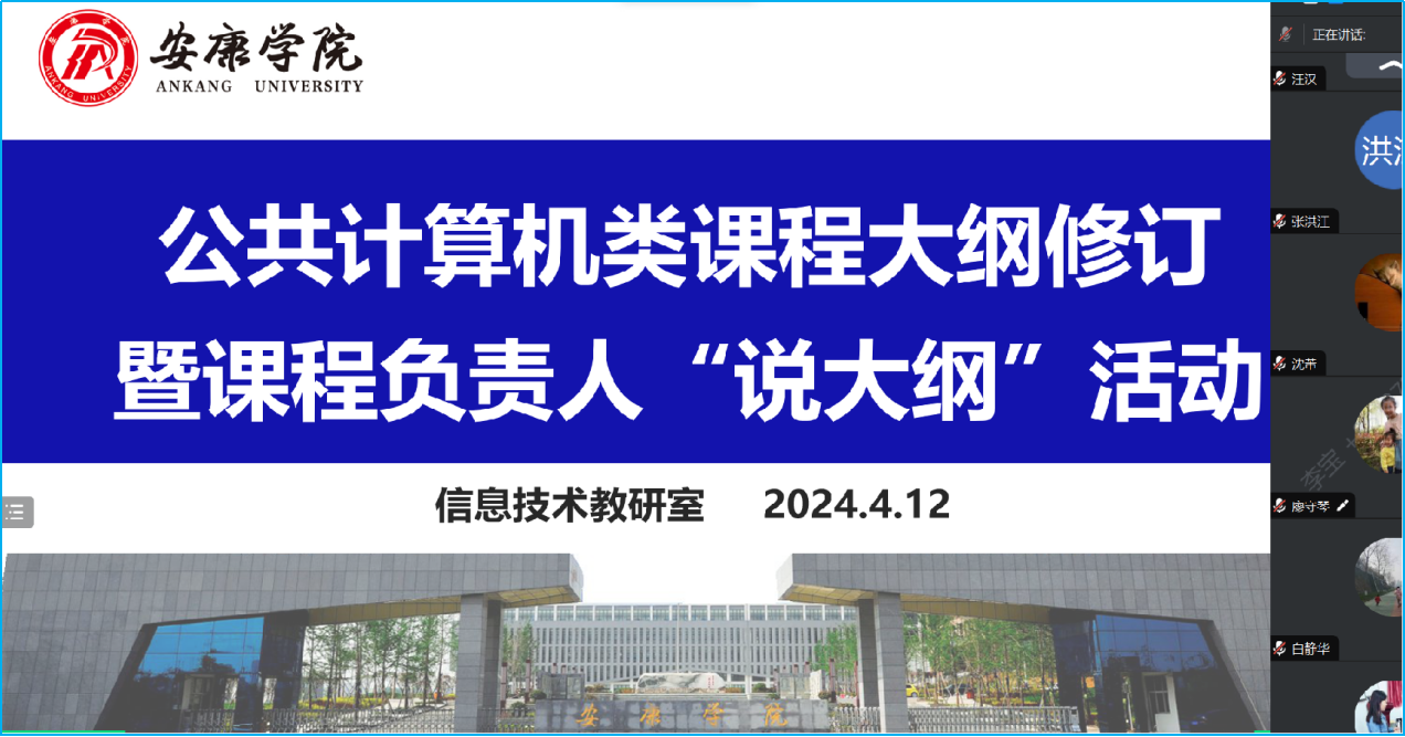 为迎接学校本科教育教学审核评估工作,深化课程改革,提高公共计算机类课程任课教师的教学水平和能力,结合学校要求及学院实际情况,信息技术教研室于2024年4月12日开展“公共计算机类课程教学大纲的修订暨课程负责人说大纲”的教研活动。此次活动采用腾讯会议线上形式举行,活动由李宝主持,澳门十大信誉好的网站教学副院长宋权华、信息技术教研室全体教师参加了本次活动。
