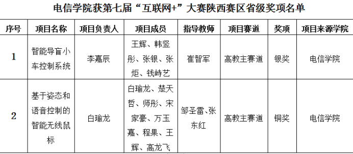 日前,陕西省教育厅办公室发布了《关于公布第七届中国国际“互联网+”大学生创新创业大赛陕西赛区获奖名单的通知》,澳门十大信誉好的网站有2个作品获奖,崔智军老师指导的《智能导盲小车控制系统》获得高教主赛道银奖,邹圣雷老师指导的《基于姿态和语音控制的智能无线鼠标》获得高教主赛道铜奖,这也是我院首次在“互联网+”大赛省赛高教主赛道中获得银奖。