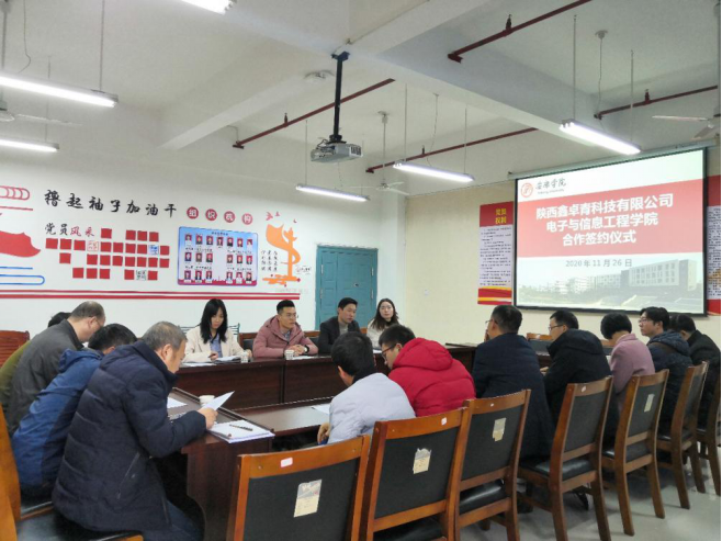 2020年11月26日下午,澳门十大信誉好的网站与陕西鑫卓青科技有限公司就合作事宜进行座谈,并举行合作签约仪式。院长陈守满、副院长王克刚、办公室主任、系(教研室、中心)主任、电子信息工程系和物联网工程系的全体教师出席了座谈会。