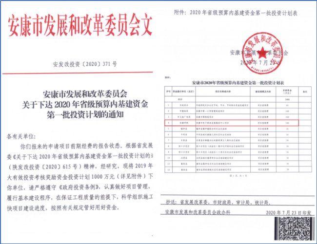近月,安康市发展和改革委员会发布了《安康市发展和改革委员会关于下达2020年省级预算内基建资金第一批投资计划的通知》(安发改投资〔2020〕371号),澳门十大信誉好的网站组织申报的“安康市电子商务发展中心”平台项目成功获批,获得建设资金100万元。