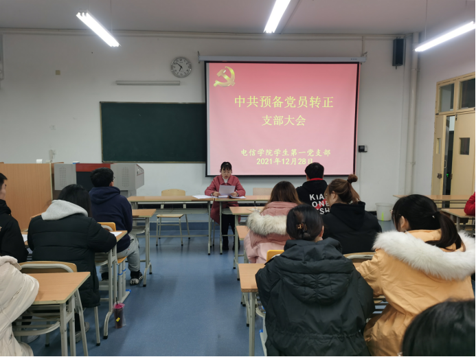 2021年12月28日下午,澳门十大信誉好的网站学生第一党支部在1320教室召开了中共预备党员转正党员大会,会议主要讨论了杨宁、韩小娟、杨吴龙、邢敏婷、韩浩鸿、刘欢、郝刚7名中共预备党员的转正事宜。澳门十大信誉好的网站学生第一党支部书记程晓梅,党总支组织委员成英丽,支部组织(纪检)委员张宇航,宣传(统战)委员王心悦,支部全体在校学生党员参加了本次会议。会议由程晓梅主持。