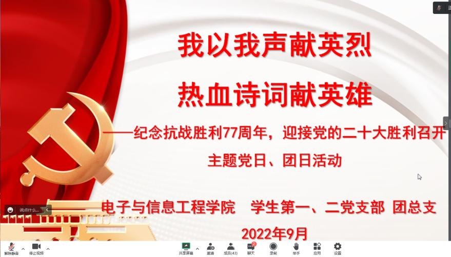 2022年9月3日是中国人民抗日战争暨世界反法西斯战争胜利77周年纪念日。为庆祝抗战胜利,2022年8月31日早上,澳门十大信誉好的网站学生第一、二党支部及团总支开展“我以我声颂英烈,热血诗词献英雄”主题党日、团日活动,诵读热血诗词,缅怀先烈,铭记历史。澳门十大信誉好的网站全体辅导员、全体学生党员、团员代表参会,活动由澳门十大信誉好的网站团总支书记张宇航主持。