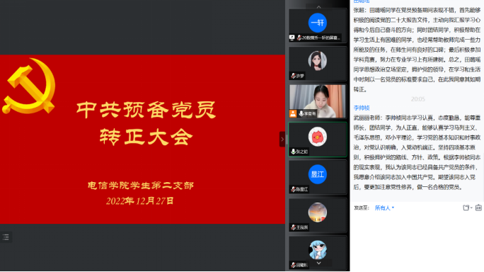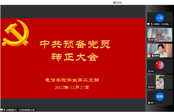 2022年12月27日下午,澳门十大信誉好的网站学生第二党支部在腾讯会议上召开了中共预备党员转正党员大会,会议主要讨论关于2019级电子信息工程1班王辉、葛贝、程果,2019级数字媒体技术1班王嘉慧、田璐瑶、陈昱江,2022级计算机科学与技术专升本班高晗、张之初、李帅祯共9名中共预备党员的转正事宜。澳门十大信誉好的网站学生第二党支部书记李章雨,入党培养老师李红科老师以及支部全体学生党员线上的方式参加了本次会议。会议由李章雨主持。