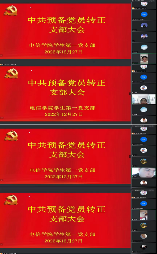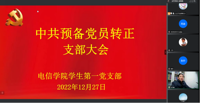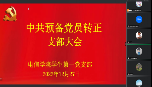 12月27日晚上八点,澳门十大信誉好的网站学生第一党支部采用线上腾讯会议的形式召开了中共预备党员转正党员大会,会议主要讨论了赵梦等8名中共预备党员的转正事宜。澳门十大信誉好的网站学生第一党支部书记吕以宁,党总支组织委员成英丽,支部组织(纪检)委员张宇航,入党培养老师王克刚、成典勤老师以及支部全体党员参加了本次会议。会议由吕以宁主持。