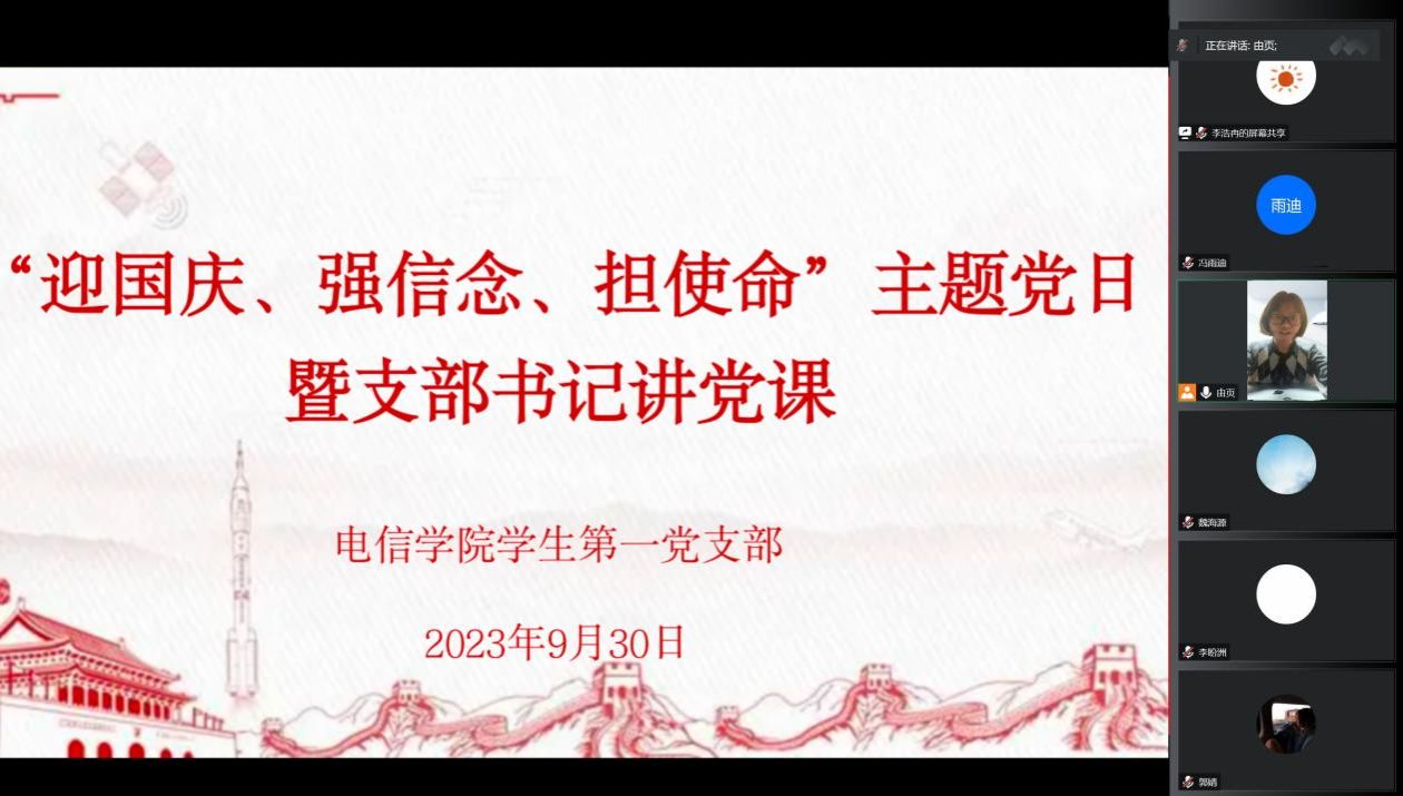 为庆祝中华人民共和国成立74周年,激励支部党员听党话、感恩党,跟党走,增强支部成员的凝聚力、战斗力和号召力,2023年9月30日下午19:30,澳门十大信誉好的网站学生第一党支部通过线上腾讯会议,开展“迎国庆、强信念、担使命”主题党日暨支部书记讲党课。本次活动由学生第一党支部书记吕以宁主持,学生第一党支部全体党员参加。
