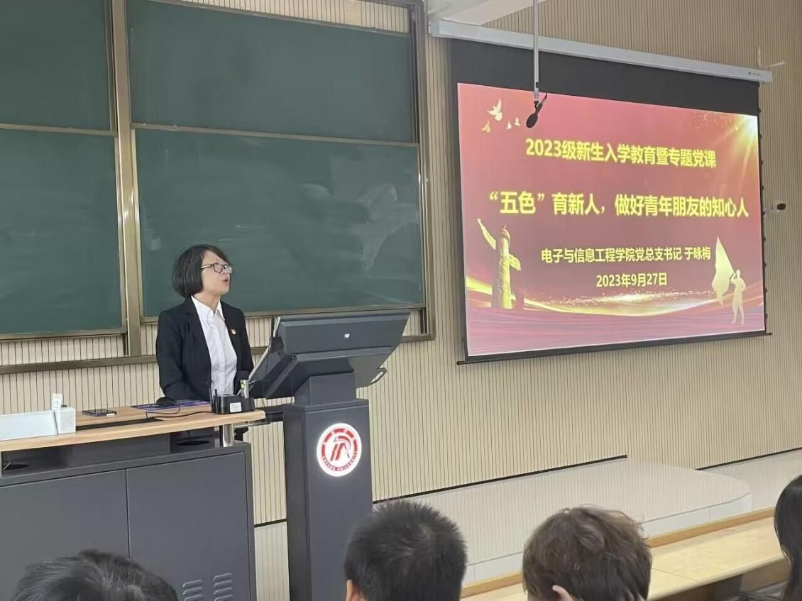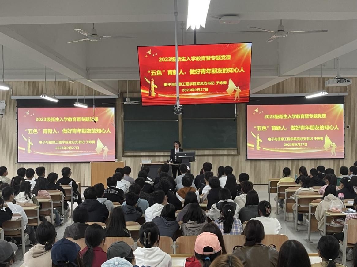 为深入学习贯彻党的二十大精神,用习近平新时代中国特色社会主义思想和习近平总书记重要讲话重要指示批示武装青年大学生,坚持立德树人根本任务,以“五色”育人模式的实践与创新引领青年大学生勇担历史使命,9月27日下午,澳门十大信誉好的网站党总支书记于咏梅在江北校区1304、1305教室讲授主题为“五色”育新人,做好青年朋友的知心人的专题党课暨新生入学教育,澳门十大信誉好的网站2023级全体新生参加。澳门十大信誉好的网站学工办主任石纭昊主持。
