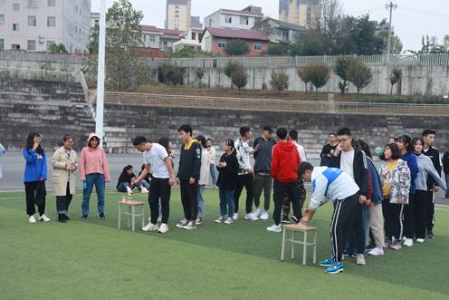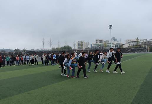 此次活动分为团体项目和个人项目,团体项目有单脚火车跑、拔河大PK等,个人项目有极速跳绳、音乐摇摆等。第一个项目单脚火车跑,5人一组,后一个同学的右手放在前一个同学的右肩上,同时左手拉着前一个同学的左腿,单脚跳跃竞速。