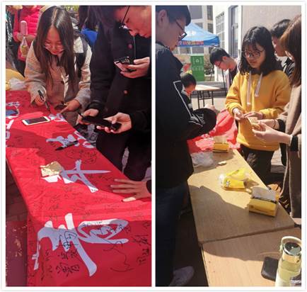 中午11点30分,在团总支副书记颜一帆的带领下,团总支各部门各行其责,有秩序的为参与活动的同学们讲解活动内容,动员大家在横幅上签字并领取绿植种子。通过澳门十大信誉好的网站全体团总支成员的不懈努力,在全校师生的积极响应下,植树节活动顺利完成。