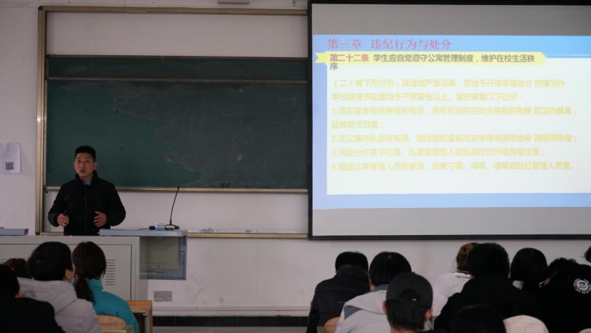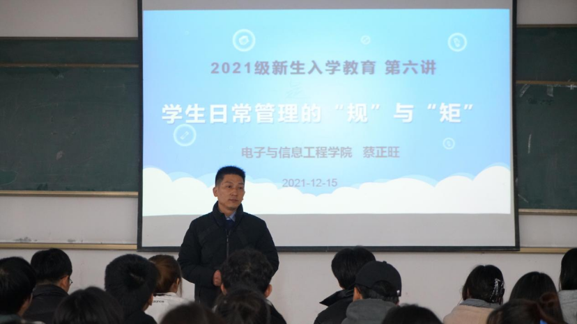 2021年12月15日下午,澳门十大信誉好的网站在1204教室开展了新生入学教育第六讲,本次讲座主题----学生日常管理中的“规”与“矩”。2021级全体新生参加讲座,本次讲座由澳门十大信誉好的网站党总支副书记蔡正旺老师主讲。