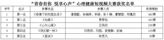 本次心理健康短视频大赛历时21天,全校共有429名学生报名参与。比赛中,参赛选手根据心理健康教育主题以创编歌曲、舞蹈、手语操、减压小故事、校园情景剧、小品、脱口秀、微电影等形式,围绕大学生日常生活、校园活动、学习、恋爱、择业、人际交往等方面所折射出的心理问题现象进行视频制作。作品内容积极健康向上,具有一定教育意义,发挥了正确引导作用,能够弘扬主旋律,传播正能量,富有青春朝气。初赛阶段学生以个人或团体参赛的形式共提交77件作品,经过评审组初步审核、评定,其中16个作品进入复赛。5月25日至5月30日,进入复赛的作品通过澳门十大信誉好的网站微信公众号(安大dxxy)公布并发起线上投票活动,最终以作品所得票数决定比赛排名。排名如下:
