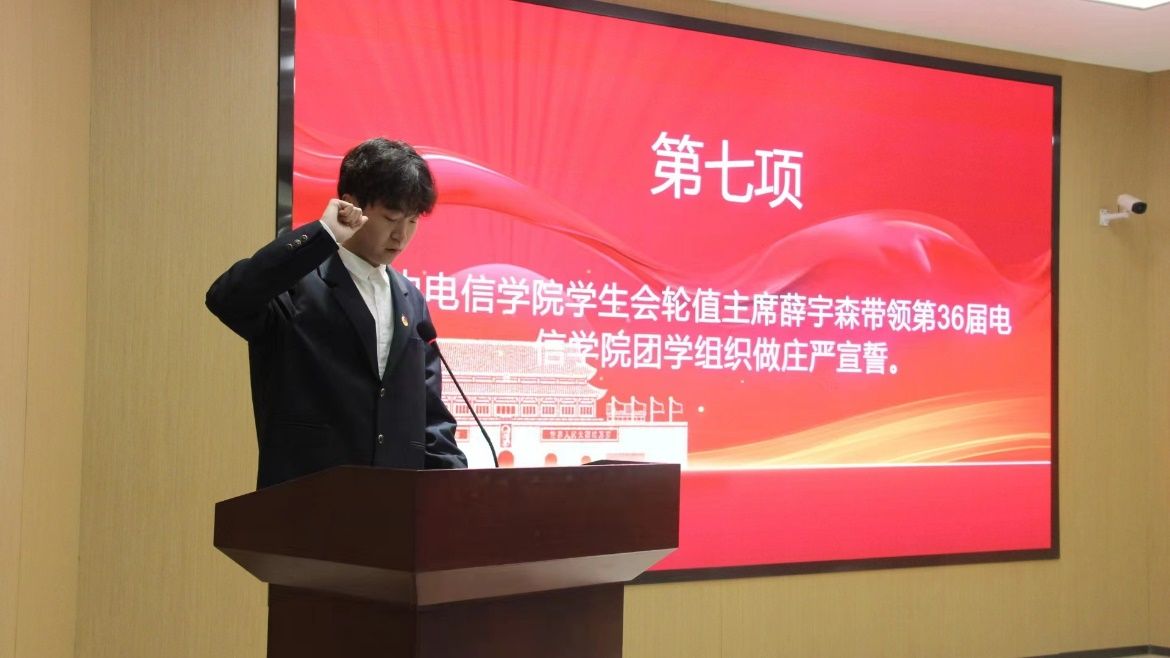 接着,张宇航及团学组织负责人分别为学生干部颁发了聘书。同时,在学生分会轮值主席薛宇森的带领下,第36届学生组织全体干部庄严宣誓,坚定了全心全意为同学服务,为澳门十大信誉好的网站更好的明天而努力奋斗的决心。