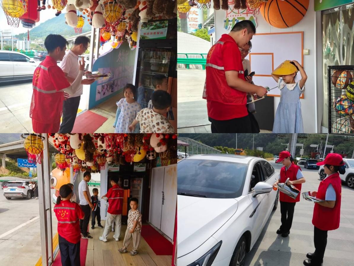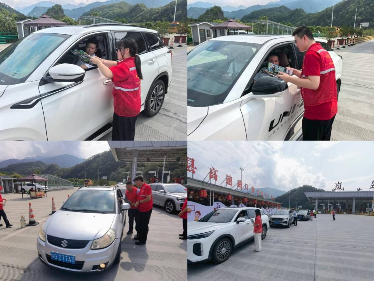 在烈阳下,收费站的工作人员与大学生志愿者们依托专业素养,并肩协作,开展安全疏导、路线咨询及道路保畅工作,同时精准提供赛事动态、景区导览和食宿推荐。他们不仅娴熟指引方向、答疑解惑,更将收费站窗口化身为岚皋的微型名片,主动分发精心准备的本地旅游指南与赛事日程,聚焦“高速路口”场景下游客最迫切需求:“怎么走?”“赛事在哪?”“住哪里?”“吃什么?”“玩什么?”。面对骤增的车流,志愿者们及时疏导,化解拥堵于无形。遇见行李繁重的观众,更是伸出援手,让旅途的终点洋溢着暖意。服务点内,清凉的矿泉水与应急药品默默守护着每一位需要的人。