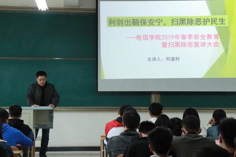 2019年3月22日下午4点,澳门十大信誉好的网站团总支于1305教室开展了2019年春季安全教育暨扫黑除恶宣讲活动。参加此次活动的有澳门十大信誉好的网站党总支书记何道利、团总支书记陈浩以及澳门十大信誉好的网站全体学生干部。