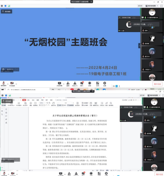 为了提高学生防范网络诈骗的意识与能力,为了引导学生远离烟草、拒绝烟草,积极营造健康、安全、文明的校园环境,4月24日澳门十大信誉好的网站各班组织学生召开以“谨防网络诈骗”与“无烟校园”为主题的班会。