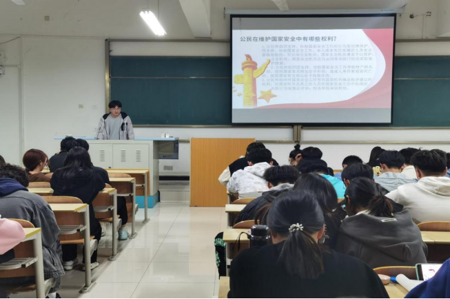 组织部樊淼从维护国家安全意义、维护国家安全我们的义务、破坏国家安全行为及公民维护国家安全中的权力四个方面讲述了国家安全。他的讲解增强了大家维护国家安全的意识,同学们维护国家安全的责任心越来越重。