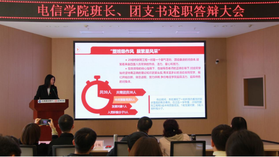 班长、团支书述职答辩是电信学院进一步加强班团一体化、学生基层组织建设和学生骨干培养的重要举措,增强了班集体凝聚力和集体荣誉感,发挥优秀班集体的模范作用。此次述职答辩大会也为班团干部提供了一个展示自我的平台,各班同学相互分享、相互学习,通过整理班级问题,延伸发展思路,总结工作概况,为未来班级规划打下夯实的基础,真正做到“任其职,谋其事”,更好地为同学们服务。