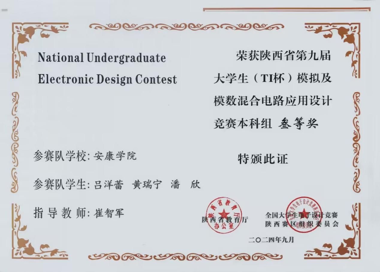 近日,陕西省教育厅、全国大学生电子设计竞赛陕西赛区组织委员会公布了2024年全国大学生电子设计竞赛陕西区赛(暨陕西省第九届大学生模拟及模数混合电路应用设计竞赛)获奖名单,澳门十大信誉好的网站学子获得了本科组三等奖。