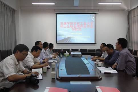 2013109,电信系与西安工业大学计算机科学与工程学院联合培养硕士研究生签字仪式在学校校图书馆六楼汉水文化研究中心会议室举行。出席会议的有副校长向纪明、科技处处长刘强,西安工业大学研究生部部长张群、计算机科学与工程学院院长白万民、研究生招生办主任王恒,以及电信系主任张东红、副主任陈守满、王庆春,签约仪式由科技处刘强教授主持。张东红主任和白万民院长代表双方在合作培养硕士研究生协议上签字。
