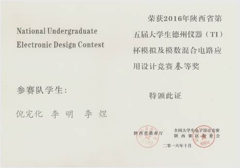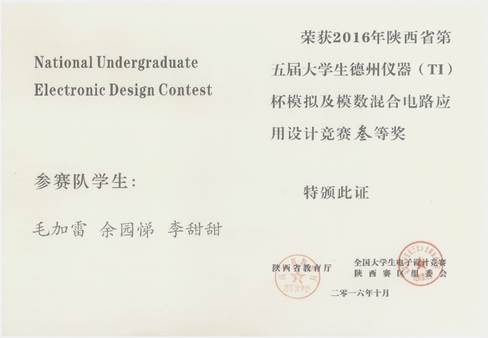2016年陕西省(TI)杯模拟及模数混合电路应用设计竞赛于7月25日(星期一)8:00至7月28日(星期四)20:00举行,共有51所院校的531支队伍参加。在校领导和教务处的关怀与支持下,澳门十大信誉好的网站精心安排电子工程系富有经验的7位老师对参加本次竞赛的学生进行了全程培训及指导,8支代表队经过一个多月的刻苦训练,竞赛期间经过四天三夜设计与制作,3只队伍按时提交参赛作品,经专家组对参赛作品进行认真评审,我校获得陕西赛区三等奖二项的良好成绩。