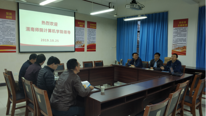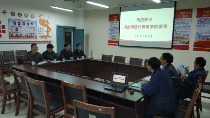 10月25日下午,渭南师范学院计算机学院院长刘军,书记杨洁,副院长何小虎,信息技术素养课程群负责人奚建荣一行到我院开展工作交流。澳门十大信誉好的网站院长陈守满,副院长王庆春、王克刚,信息技术教研室主任宋权华热情接待了刘军一行,并在逸夫科技楼会议室召开了座谈会。座谈会由院长陈守满主持。