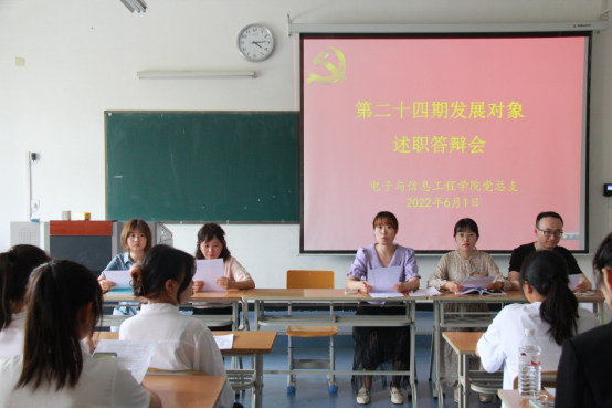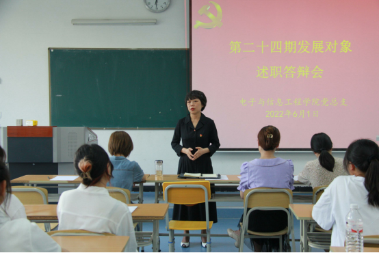 为深入贯彻落实党的十九大精神和习近平新时代中国特色社会主义思想,把好党员“发展关”,切实提升党员发展质量,结合支部党员发展工作需要,6月1日下午,澳门十大信誉好的网站学生第一、第二党支部在江北校区1319教室开展了2022年上半年发展对象述职答辩会,澳门十大信誉好的网站党总支书记于咏梅,党总支组织委员成英丽,学生第一党支部书记程晓梅、组织(纪检)委员张宇航,学生第二党支部书记李章雨、组织(纪检)委员石纭昊、辅导员吕以宁以及19名第24期发展对象参加答辩会。会议由学生第二党支部书记李章雨主持。