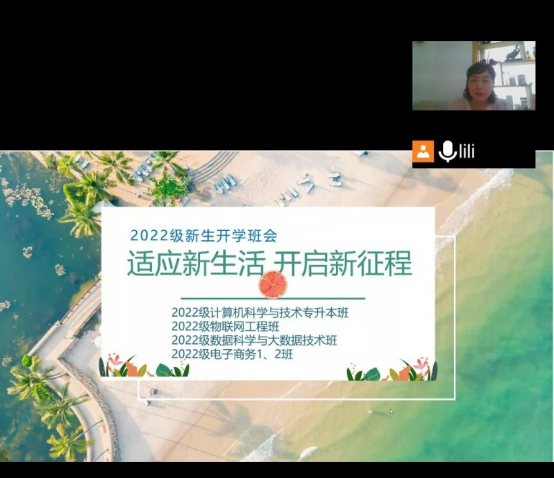 2022年9月10日上午,澳门十大信誉好的网站2022级新生班级在线上召开了以“奋斗新征程 筑梦新启航”为主题的入学班会,班会由辅导员成英丽老师主持,2022级计算机科学与技术、物联网工程、数据科学与大数据技术、电子商务专业全体同学参加。