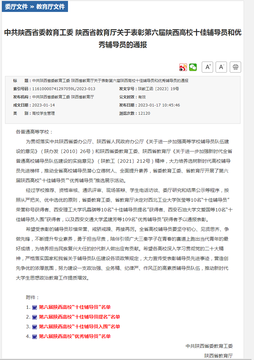 近日,中共陕西省委教育工委、陕西省教育厅发布《关于表彰第六届陕西高校十佳辅导员和优秀辅导员的通报》,澳门十大信誉好的网站辅导员成英丽获评陕西高校“优秀辅导员”荣誉称号。