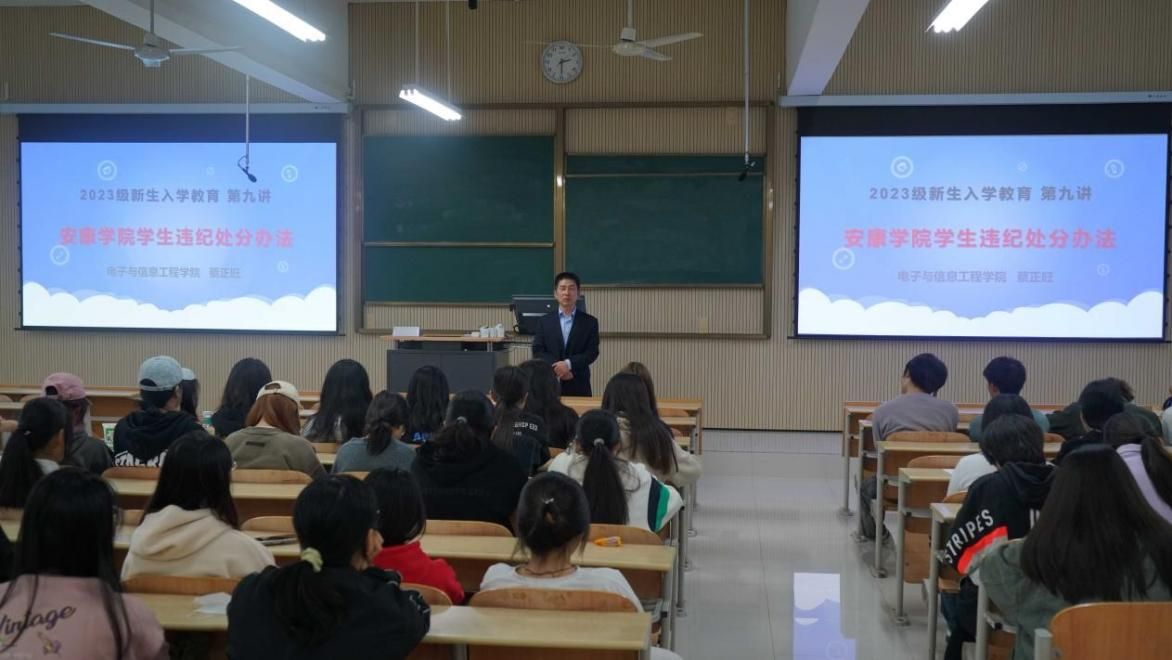 为了加强新生纪律观念,规范行为习惯,严肃校风校纪,促进学生健康成长,10月18日下午,澳门十大信誉好的网站党总支副书记蔡正旺在江北校区1204教室讲授主题为“澳门十大信誉好的网站学生违纪行为处分办法”新生教育大会,澳门十大信誉好的网站2023级全体新生参加。