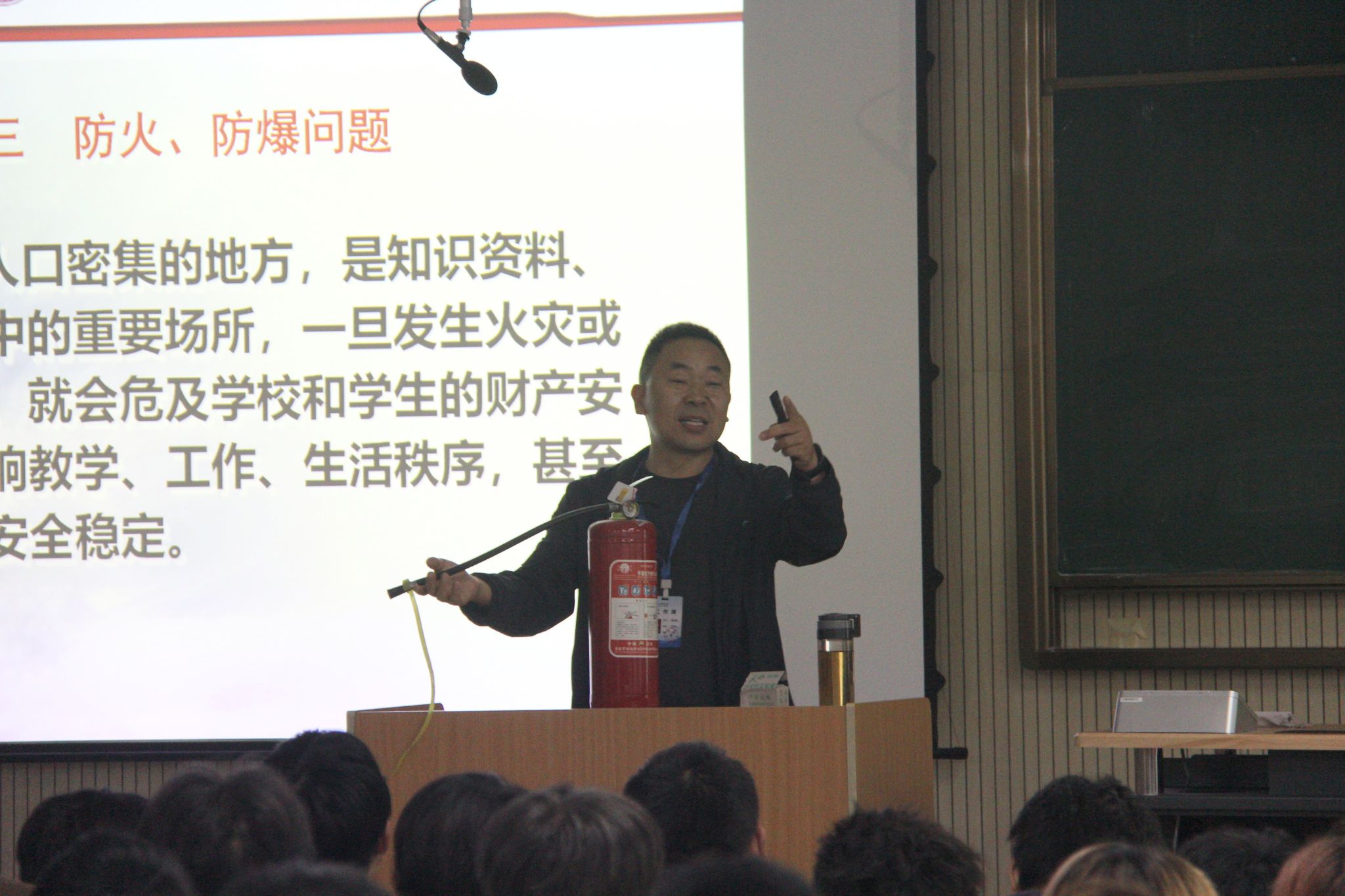 (保卫处处长王开忠开展安全教育,演示灭火器用法)