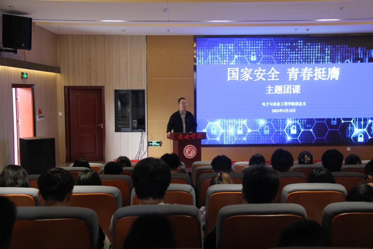在第九个全民国家安全教育日来临之际,为深入学习习近平总书记关于总体国家安全观的重要论述,不断增强学生国家安全意识,筑牢国家安全防线,努力营造“国家安全,人人有责”的良好氛围,4月15日,澳门十大信誉好的网站团总支在江北校区图书馆报告厅开展了以“国家安全 青春挺膺”为主题的国家安全主题团课。学院团总支书记张宇航主讲,100余名在校团员青年代表参加学习。