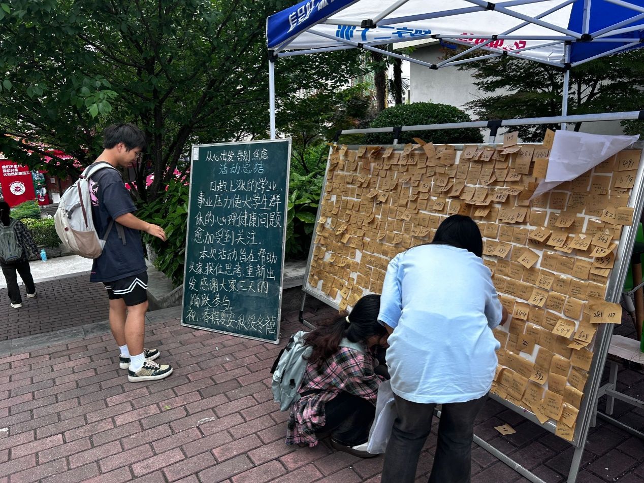 为帮助学生健康发展,坦然面对负面情绪,更好地把握生活节奏,澳门十大信誉好的网站于2024年5月7日至9日在江北校区5、6号公寓楼中间举办“从心出发,告别焦虑”活动,全校约一千余人次参与此次活动。