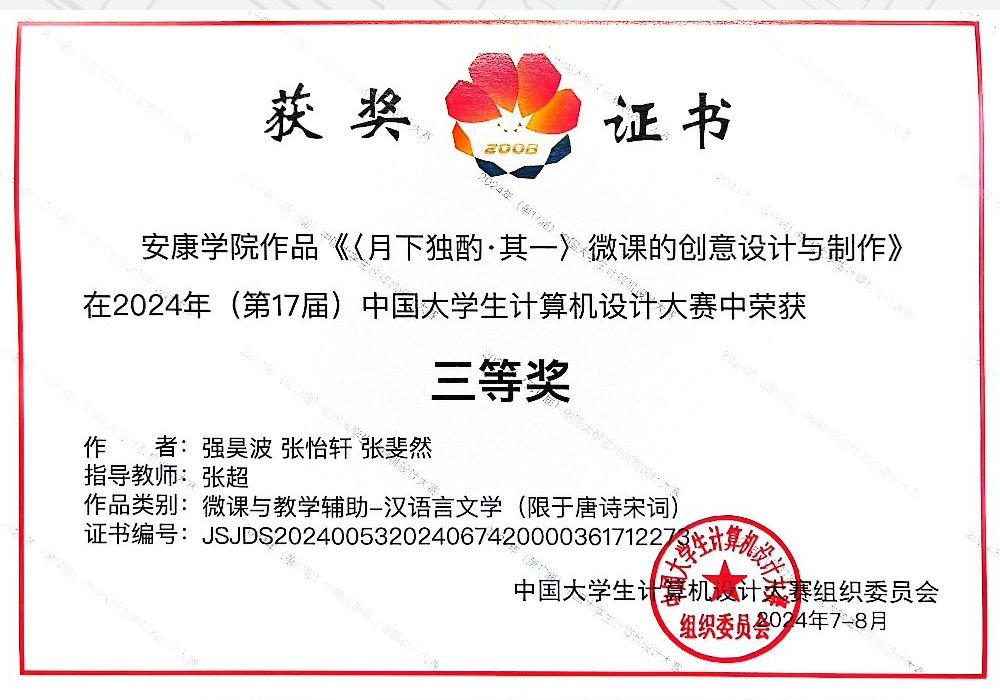 近日,2024年(第17届)中国大学生计算机设计大赛圆满落幕,我院学子在该比赛中喜获佳绩。本次大赛从2024年1月开始启动,按照校级初赛—省级决赛—全国总决赛三级竞赛形式开展。全校共60个作品报名参赛,经校内初赛选拔,我院有18个作品被推荐参加了5月在宁夏师范大学举行的西北地区赛,参赛作品全部获奖,其中,获省级一等奖1项,省级二等奖7项,省级三等奖10项。在7-8月举行的全国总决赛中,经现场答辩展示、专家组评定,我院3件作品荣获国家级二等奖1项,国家级三等奖2项。