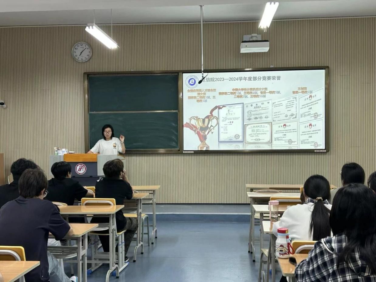 宣讲过程中,社团服务中心的宣讲员们结合自身参与竞赛的实战经验,针对各项赛事的差异化特点展开细致讲解。如对于“挑战杯” 全国大学生课外学术科技作品竞赛,宣讲员重点梳理 “选题申报-作品打磨-校级选拔-省级复赛-全国决赛” 的全流程,强调 “学术性与创新性结合” 的参赛要求;针对中国国际大学生创新大赛(“互联网 +” 大赛),宣讲团队则聚焦“商业逻辑构建”,从“项目定位-团队组建-商业计划书撰写-路演答辩” 四个维度拆解技巧,特别提醒新生“需结合电信专业优势,挖掘 5G、人工智能、物联网等领域的创业切入点”。同时展示学院近三年在各项赛事中的成果。
