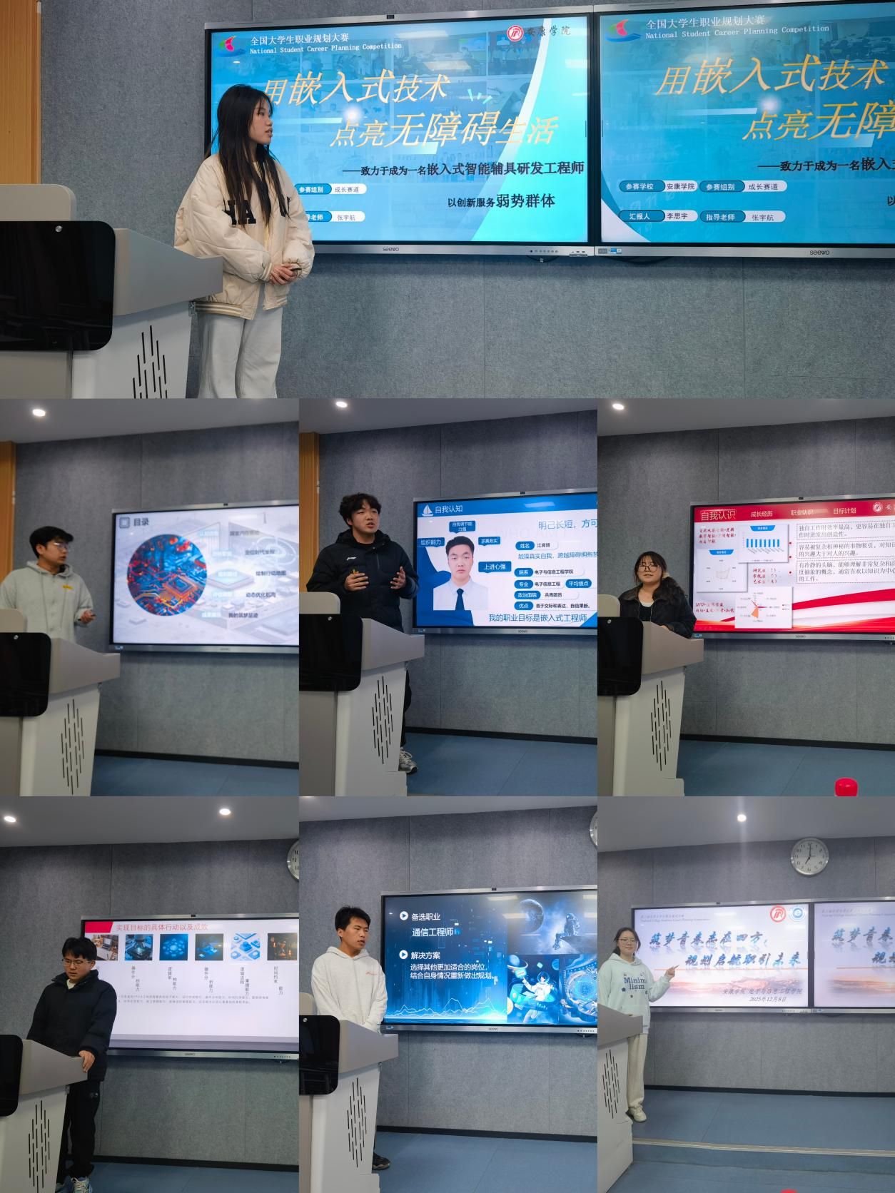 赛前,学院高度重视本次初赛工作,通过主题班会、专业群通知、微信公众号等多渠道广泛动员。比赛现场,来自不同年级的参赛选手依据所选赛道依次登台展示。成长赛道上,本科一至三年级学子围绕“软件开发”、“嵌入式开发工程师”等职业目标,结合专业课程学习、科创竞赛经历及暑期实践成果,清晰阐述职业规划的形成过程与实施路径,展现出扎实的专业认知与积极的成长姿态。其中,2023级电子信息工程专业学生李思宇同学以“从单片机入门到嵌入式开发”的成长故事为切入点,分享了通过参与“助盲者计划”项目提升实践能力的经历,其清晰的目标导向与持续行动意识获得评委一致认可。