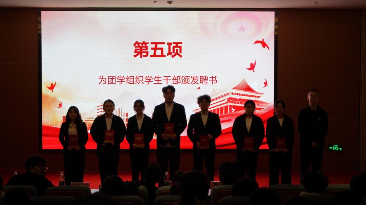 在全场的热烈掌声中,大会迎来了聘书颁发与授牌仪式。田静、成英丽、张宇航、翟子轩、贾金兵分别团学组织干部颁发聘书,一张张崭新的聘书不仅是身份的象征,更是责任的传递,39名团总支干部、31名学生会干部、6名社团服务中心干部接过了服务学院、服务同学的“接力棒”。授牌仪式结束后,学生分会轮值主席孙志豪带领第38届团总支、学生会全体成员庄严宣誓,铿锵有力的誓言彰显了新一届学生干部的担当与决心。