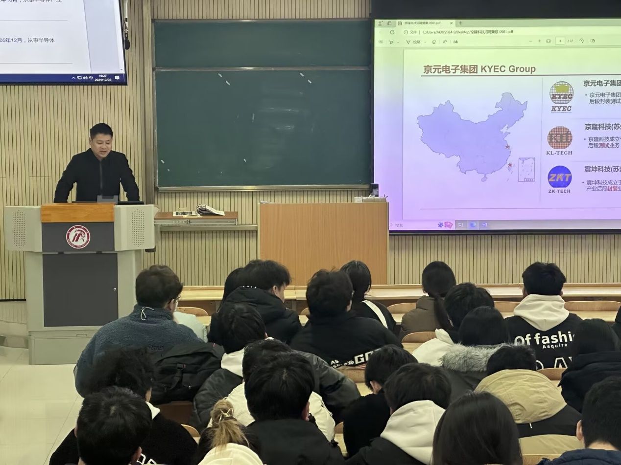 会议上,京隆科技(苏州)限公司的代表介绍了介绍了公司的发展历程、企业文化和主要业务,详细介绍了公司的招聘岗位、岗位职责、职业发展路径,并分享了公司的工作环境、住宿条件和福利待遇等信息。该公司诚挚邀请具有责任心、事业心和进取心的优秀毕业生加入。